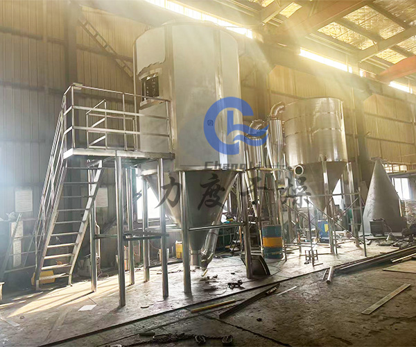 空氣通過過濾器和加熱器,進入離心噴霧干燥器頂部的空氣分配器,熱空氣呈螺旋狀均勻進入干燥器。料液由料液槽經過濾器由泵送至干燥器頂部的離心霧化器,使料液噴成極小的霧狀液滴,料液和熱空氣并流接觸,水分迅速蒸發,在極短時間內干燥成成品,成品由干燥塔底部和旋風分離器排出,廢氣由風機排出。