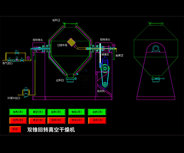 雙錐回轉(zhuǎn)真空干燥機(jī)為雙錐形的回轉(zhuǎn)罐體,罐內(nèi)在真空狀態(tài)下,向夾套內(nèi)通入蒸汽或熱水進(jìn)行加熱,熱量通過罐體內(nèi)壁與濕物料接觸,濕物料吸熱后蒸發(fā)的水汽,通過真空泵經(jīng)真空排氣管被抽走。由于罐體內(nèi)處于真空狀態(tài),且罐體的回轉(zhuǎn)使物料不斷的上下內(nèi)外翻動(dòng),故加快了物料的干燥速度,提高干燥效率,達(dá)到均勻干燥的目的。雙錐回轉(zhuǎn)真空干燥機(jī)系統(tǒng)主要由雙錐回轉(zhuǎn)真空干燥機(jī)、冷凝器、除塵器、真空抽氣系統(tǒng)、加熱系統(tǒng)、冷卻系統(tǒng)、電控系統(tǒng)等組成。