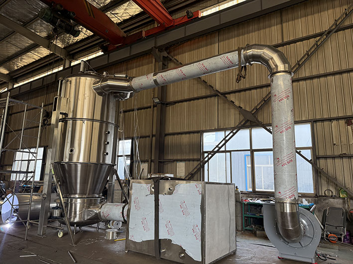 同步干燥定型:熱空氣在維持流化狀態(tài)的同時,持續(xù)帶走顆粒表面水分,含濕空氣經(jīng)頂部防靜電濾袋捕集粉塵后排出,通過脈沖反吹裝置實現(xiàn)濾袋在線清灰,確保干燥效率與環(huán)境潔凈度。