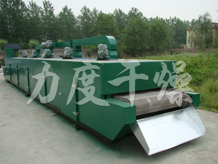 物料由加料器均勻地鋪在網帶上,網帶一般采用12-60目不銹鋼絲網,由傳動裝置拖動在干燥機內移動。干燥機由若干單元組成,每一單元熱風獨立循環,部分尾氣由專門排濕風機排出,廢氣由調節閥控制,熱氣由下往上或由上往下穿過鋪滿物料的網帶完成熱量與質量傳遞的進程,帶走物料水份。網帶緩慢移動,運行速度可根據物料溫度自由調節,干燥后的成品連續落入收料器中。上下循環單元根據用戶需要可靈活配備,單元數量亦可根據需要選取。