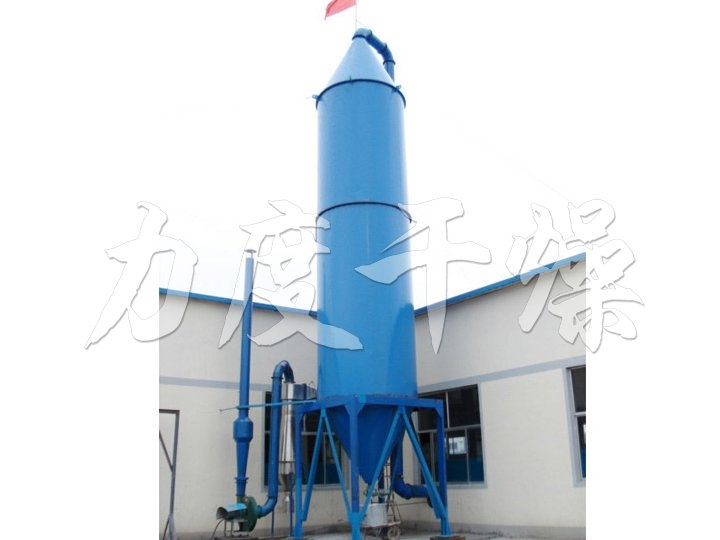 空氣通過加熱器加熱后;經送風機進入干燥塔頂部的熱風分配器;通過熱風分配器后,熱空氣均勻的進入干燥塔內,并呈螺旋狀運動。實泵同時將料液送至干燥塔頂部的離心噴霧器,料液被噴成極小的霧狀液滴。使料液和熱空氣接觸的表面積大大增加,水份迅速蒸發,在極短的時間內干燥為干品。干品由旋風分離器與濕空氣分離,經旋風分離底部的集料旋蝸室由干燥的空氣送至小旋風分離器分離,并收集在收料筒,尾氣經引風機排出。